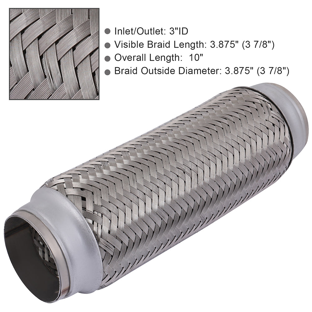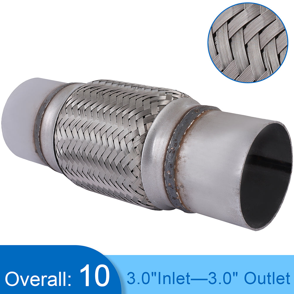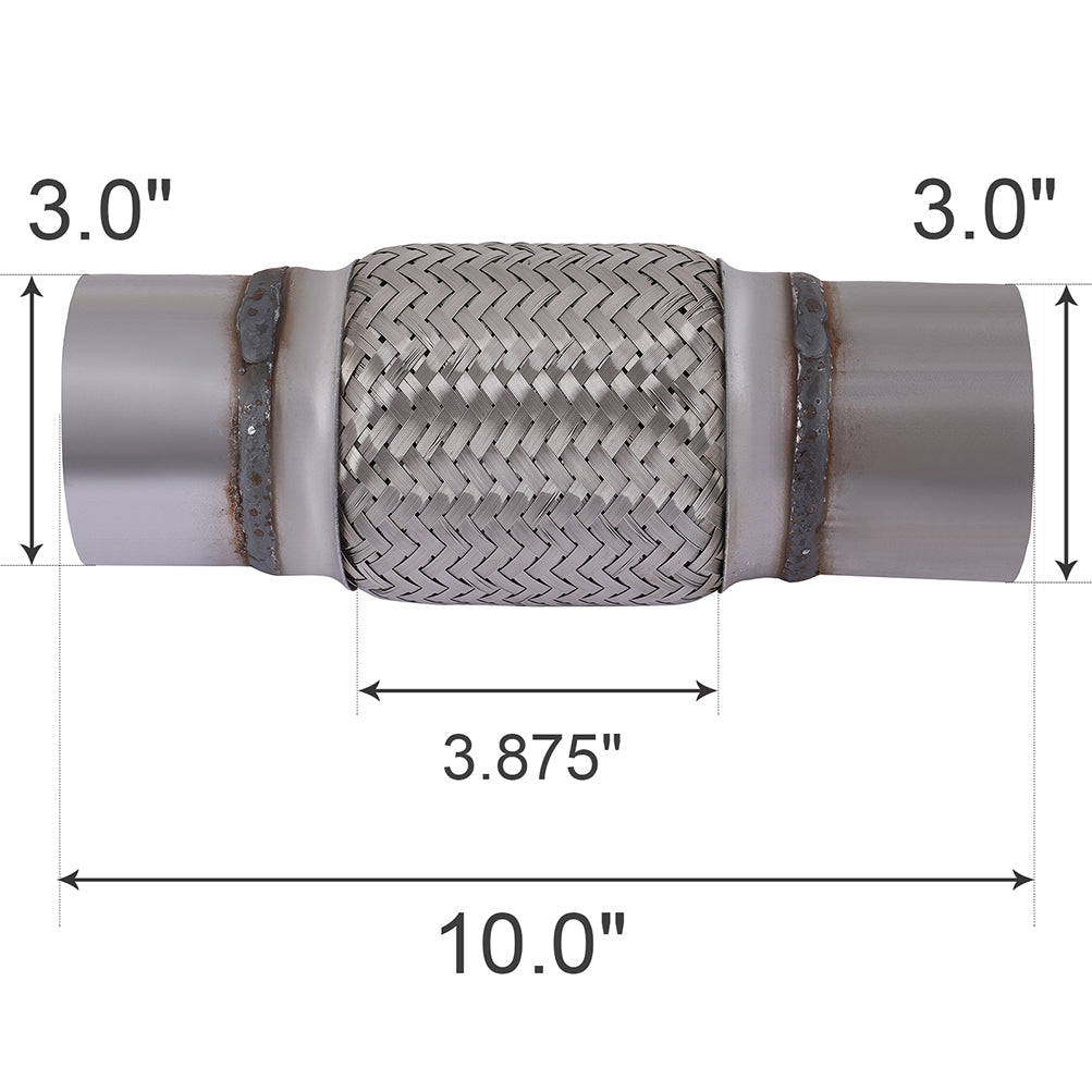 Whether you are repairing your exhaust or making a custom turbo setup, our 3" X 6" X 10" Long Exhaust Flex Pipe will help you get the job done. Each end is sized to slip over any type of tubing and is ready to weld. Double braided to ensure durability and made from stainless steel to ensure it will last as long as you have the vehicle. Be sure to check out our other listings as we have the parts to help with any exhaust or turbo setups.