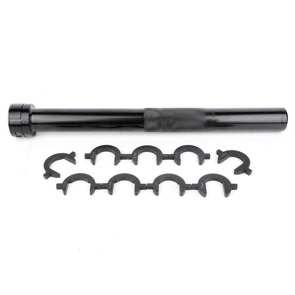 Includes 1 long socket removal tool and 9 crow's foot sizes. S.A.E.: 1-3/16", 1-1/4", 1-5/16", 1-3/8",1-7/16", 1-1/2" Metric: 29mm, 32.5mm, 33.6mm.