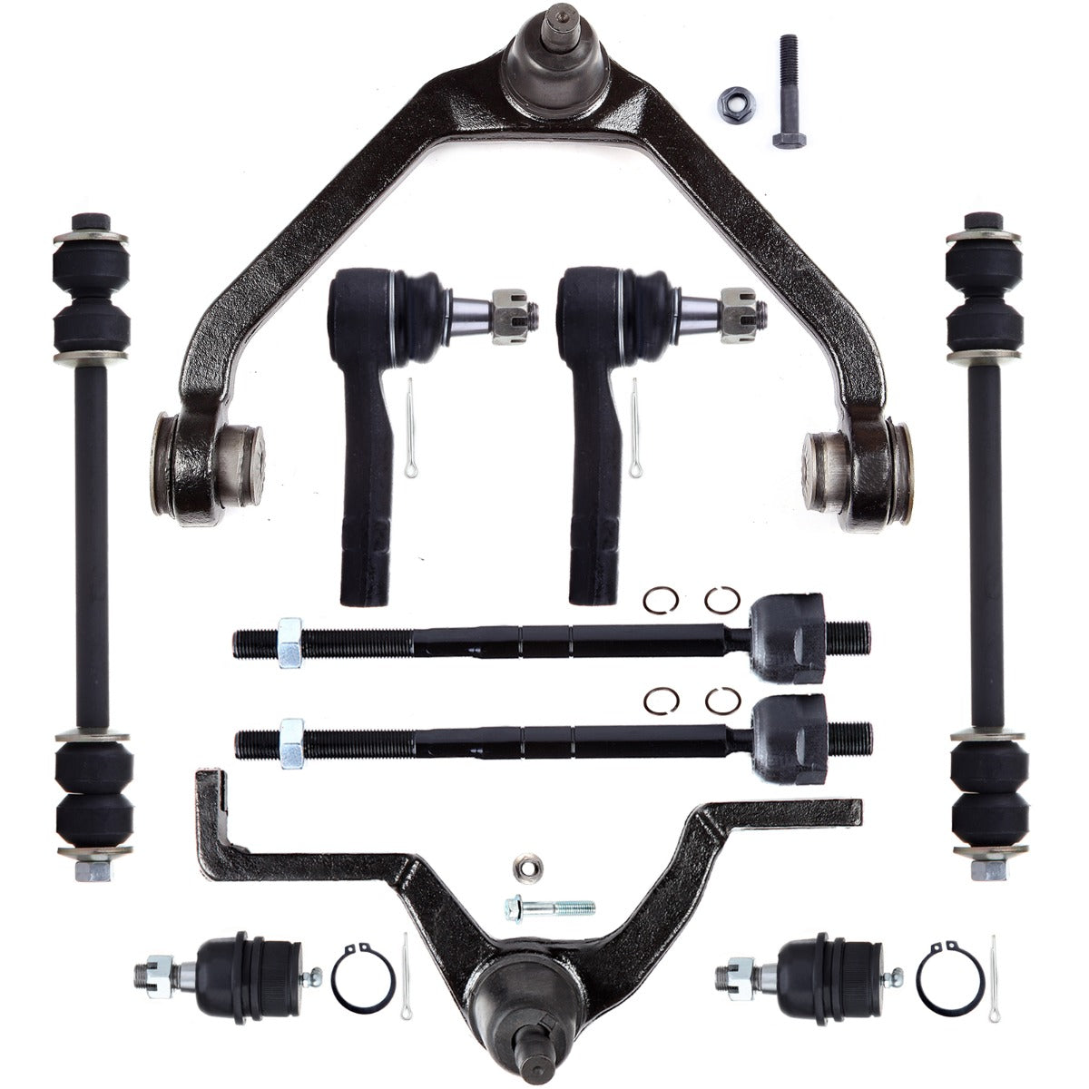 1.Specifications:(2)EV317 Front Inner Tie Rod End,(2)K8695T Front Lower Ball Joint,(2)ES3461 Front Outer Tie Rod End,(2)K7275 Front Sway Bar End Link,(1)K8710T Front Upper Control Arm - 2 Piece Design Arm - Passenger Side,(1)K8708T Front Upper Control Arm And Ball Joint - Driver Side