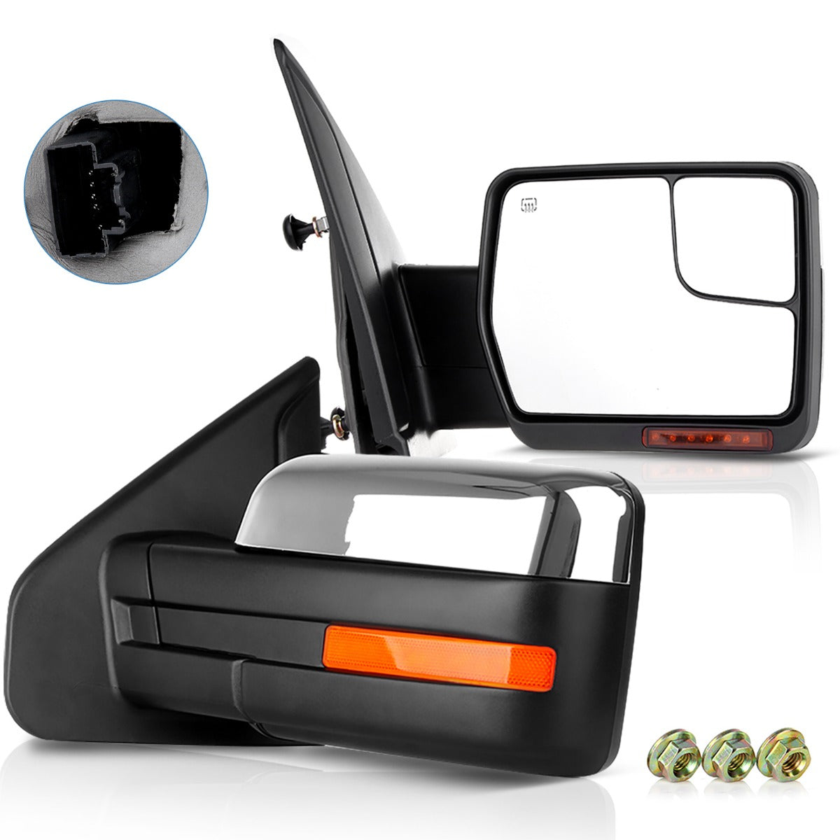 - Mirror options: power, heated, turn signal light, puddle light, Reflective Strip, telescoping manually, chrome Cap Housing